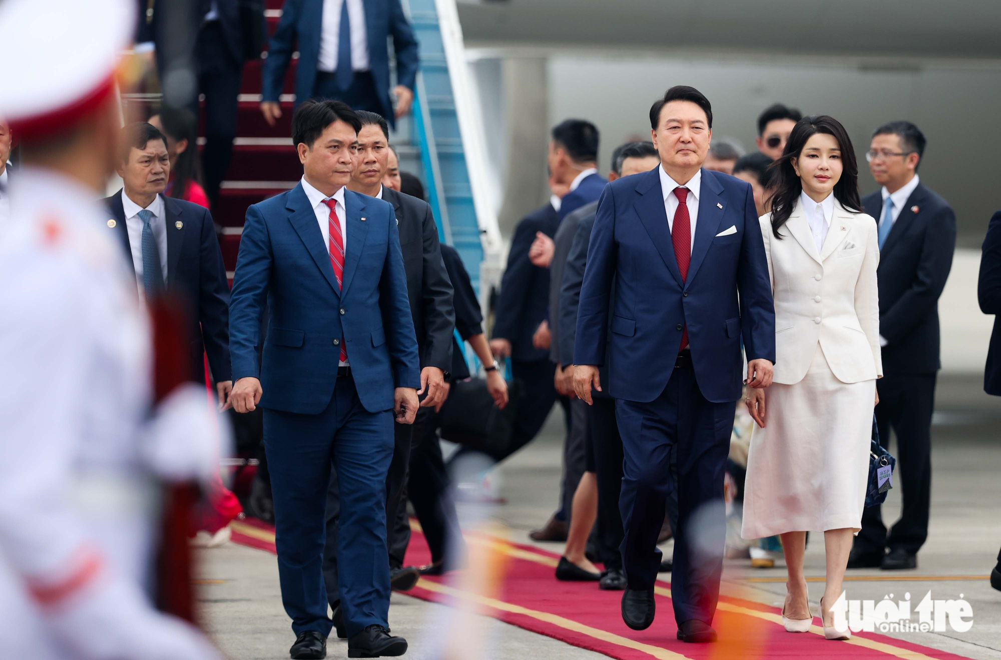 Đón Tổng thống Yoon và phu nhân tại sân bay có Chủ nhiệm Văn phòng Chủ tịch nước Lê Khánh Hải, Chủ tịch UBND TP Hà Nội Trần Sỹ Thanh, Thứ trưởng Bộ Ngoại giao Nguyễn Minh Vũ, Đại sứ Việt Nam tại Hàn Quốc Nguyễn Vũ Tùng, Đại sứ Hàn Quốc tại Việt Nam Oh Young Ju cùng đại diện một số cơ quan.